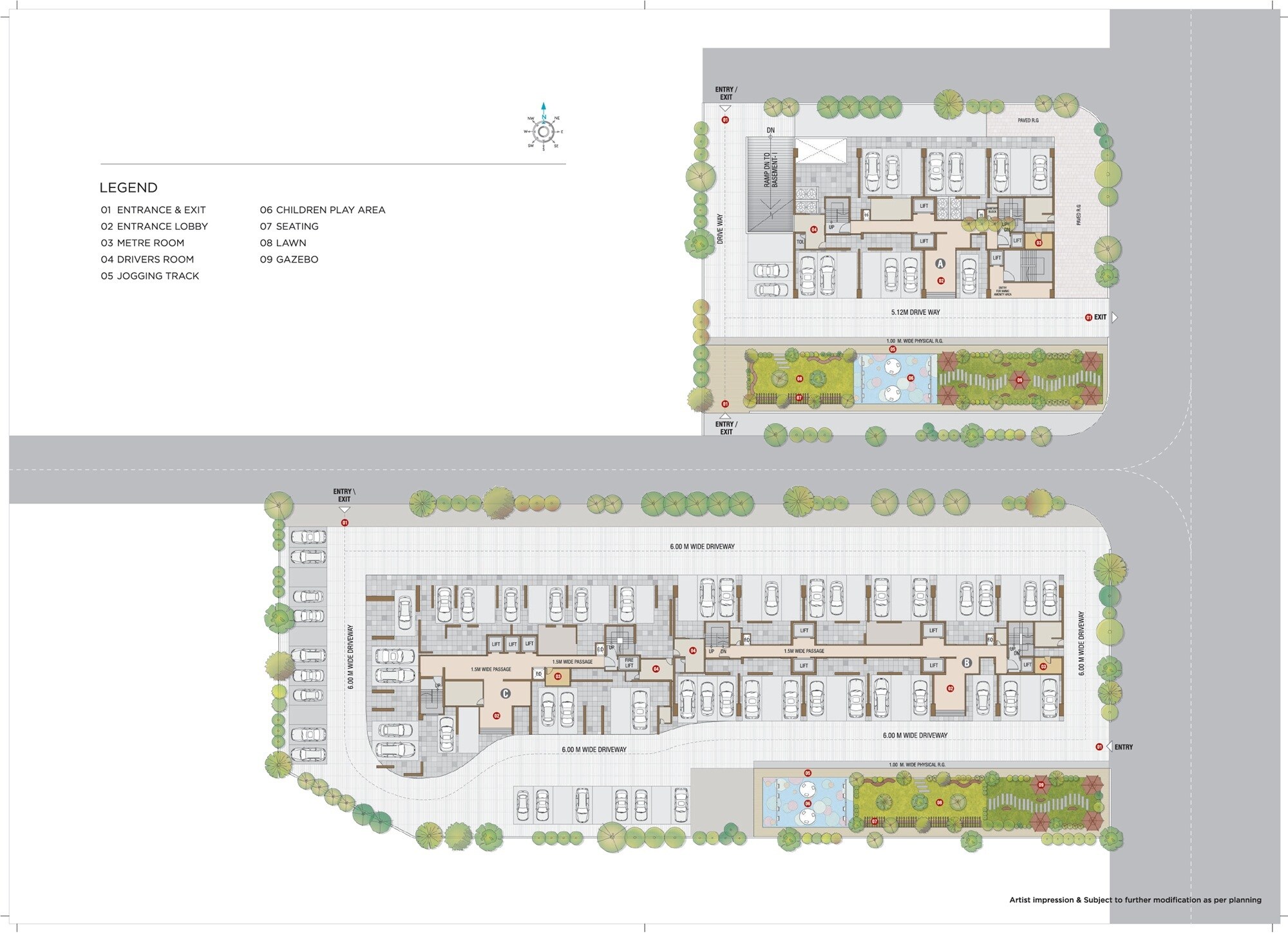 The master plan allocates space for multi-story buildings, extensive surface parking areas, and a variety of green and recreational open spaces. These open spaces include dedicated children's play areas, seating zones, expansive lawns, and gazebos.