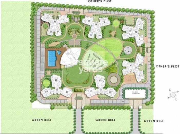 This master plan allocates significant space to residential towers, numbered 1 through 22, concentrated around a large central green area. The development includes designated 'GREEN BELT' areas on its periphery, indicating planned open and natural spaces. There's also a specific block marked as 'PROPOSED COMMERCIAL,' integrating commercial activity within the residential complex. Adjacent areas are labeled as 'OTHER'S PLOT,' indicating neighbouring land not part of this development.