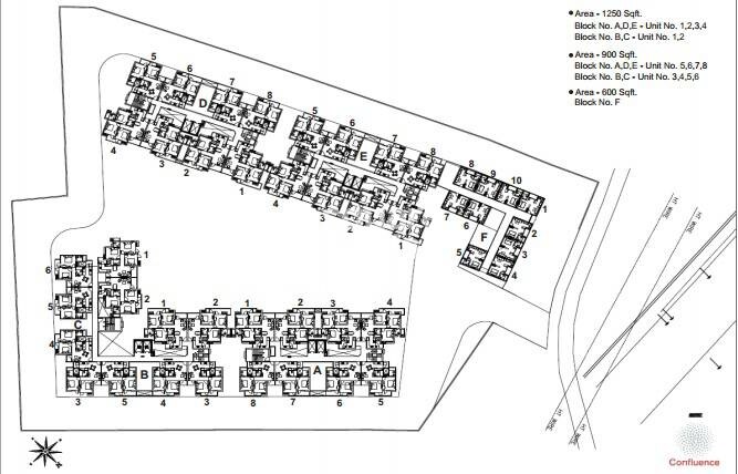 The master plan primarily allocates space for residential use, with blocks A through F accommodating various unit sizes. There are no other explicitly designated commercial or large-scale open space zones labeled within the visible plan, beyond the residential structures themselves.