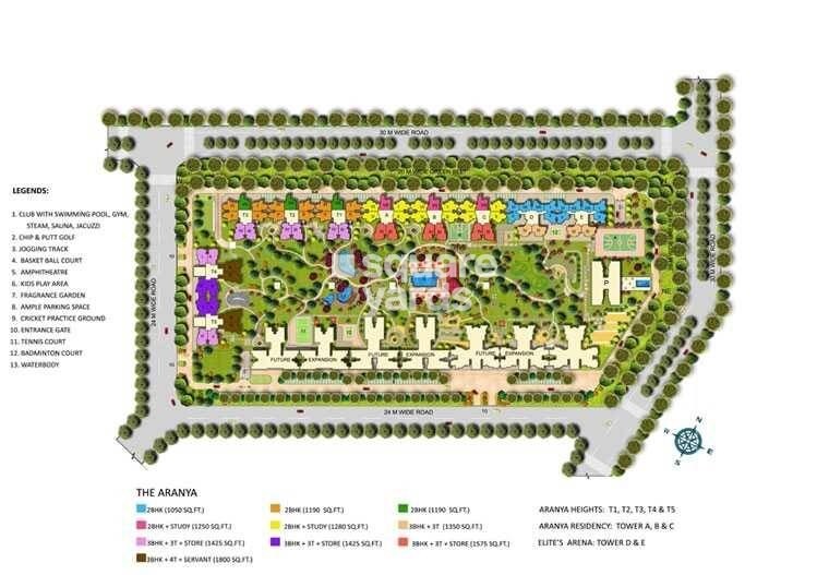 Unnati The Elite Address features a comprehensive residential development encompassing Aranya Heights with Towers T1, T2, T3, T4, and T5, Aranya Residency with Towers A, B, and C, and Elite's Arena with Towers D and E. This totals 10 residential towers within the master plan.