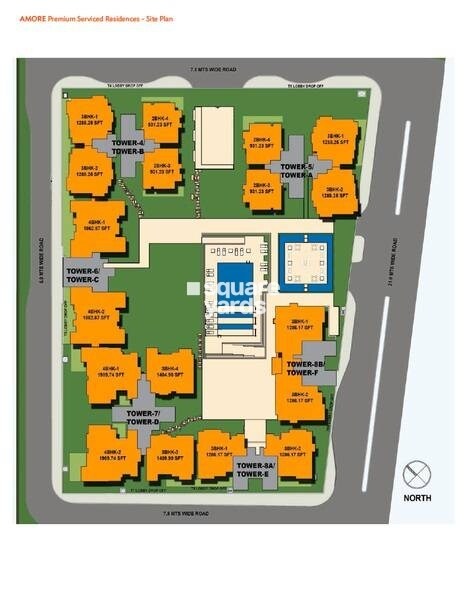 The project is AMORE Premium Serviced Residences. This master plan outlines a development comprising six distinct residential towers, each identified by a dual designation, such as Tower-4/Tower-B, Tower-5/Tower-A, Tower-6/Tower-C, Tower-7/Tower-D, Tower-8A/Tower-E, and Tower-8B/Tower-F. The plan focuses on the layout of these structures, integrated amenities, and site access. Information regarding total land area, the exact total number of units, or project launch and completion dates is not visible on this master plan.