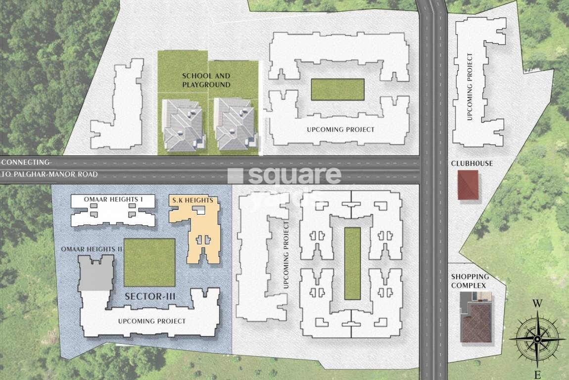 The master plan for SK Heights Palghar provides an overview of a planned development, though it does not explicitly state the total land area, number of units, number of towers, or specific project launch and completion dates.