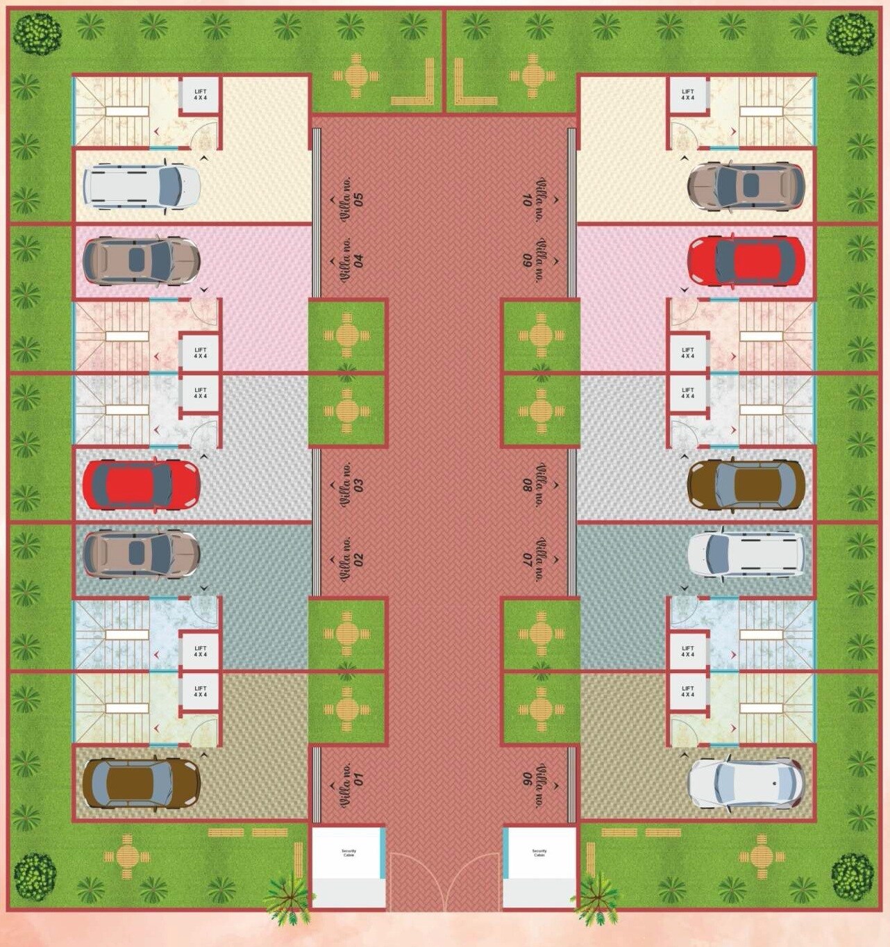 The master plan effectively utilizes the land to create a residential community centered around individual villas. It's laid out with two main rows of villas, separated by a central driveway/pathway, and interspersed with ample green spaces and dedicated parking areas for each residence.