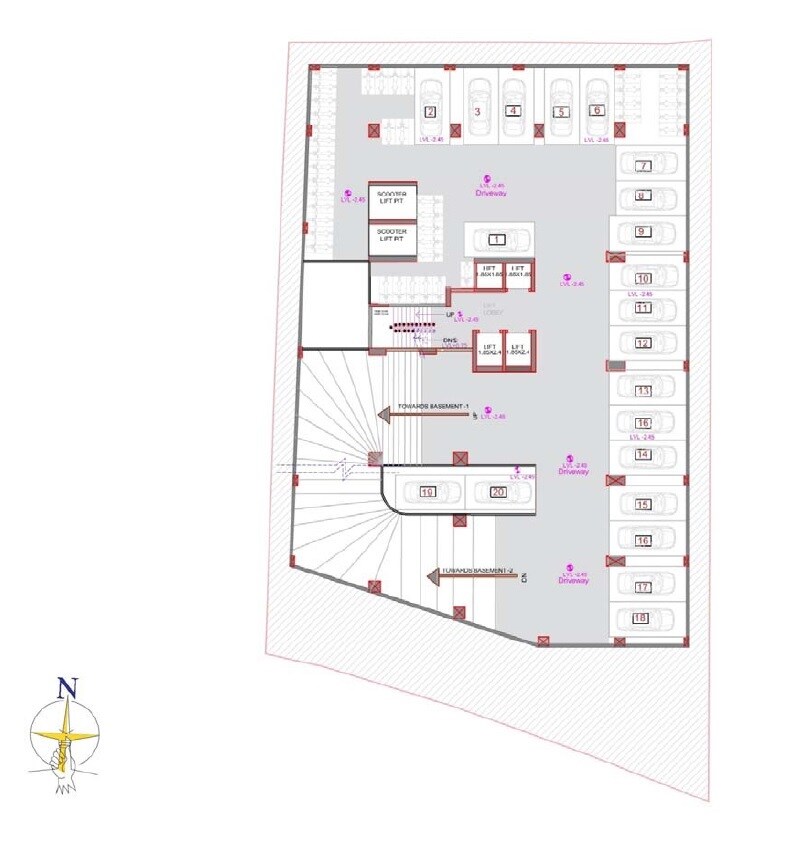 This detailed plan outlines a basement parking level for the Avenue Promenade project, located in Baner. While this specific plan doesn't provide details on total land area, the number of residential units, or tower count, it shows a well-organized parking facility. The project itself is strategically positioned with excellent connectivity, being just 0.5 km from Baner Road and 1.5 km from the Mumbai-Bangalore Highway. This basement level offers 20 individual parking spaces.