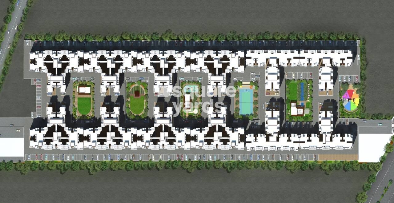 The master plan for Essen Aishwaryam Hamara Phase II shows a primarily residential development featuring multiple building blocks arranged in an elongated rectangular layout. Significant portions are allocated to open spaces, including landscaped green areas and recreational facilities, alongside extensive parking zones.