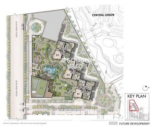 This master plan allocates significant space to residential use with the three towers. You'll find extensive green and open spaces, most notably a large 'CENTRAL GREEN' area, along with numerous landscaped gardens integrated throughout the development. There's also a clearly designated area for 'FUTURE DEVELOPMENT' located on the southern side of the property.