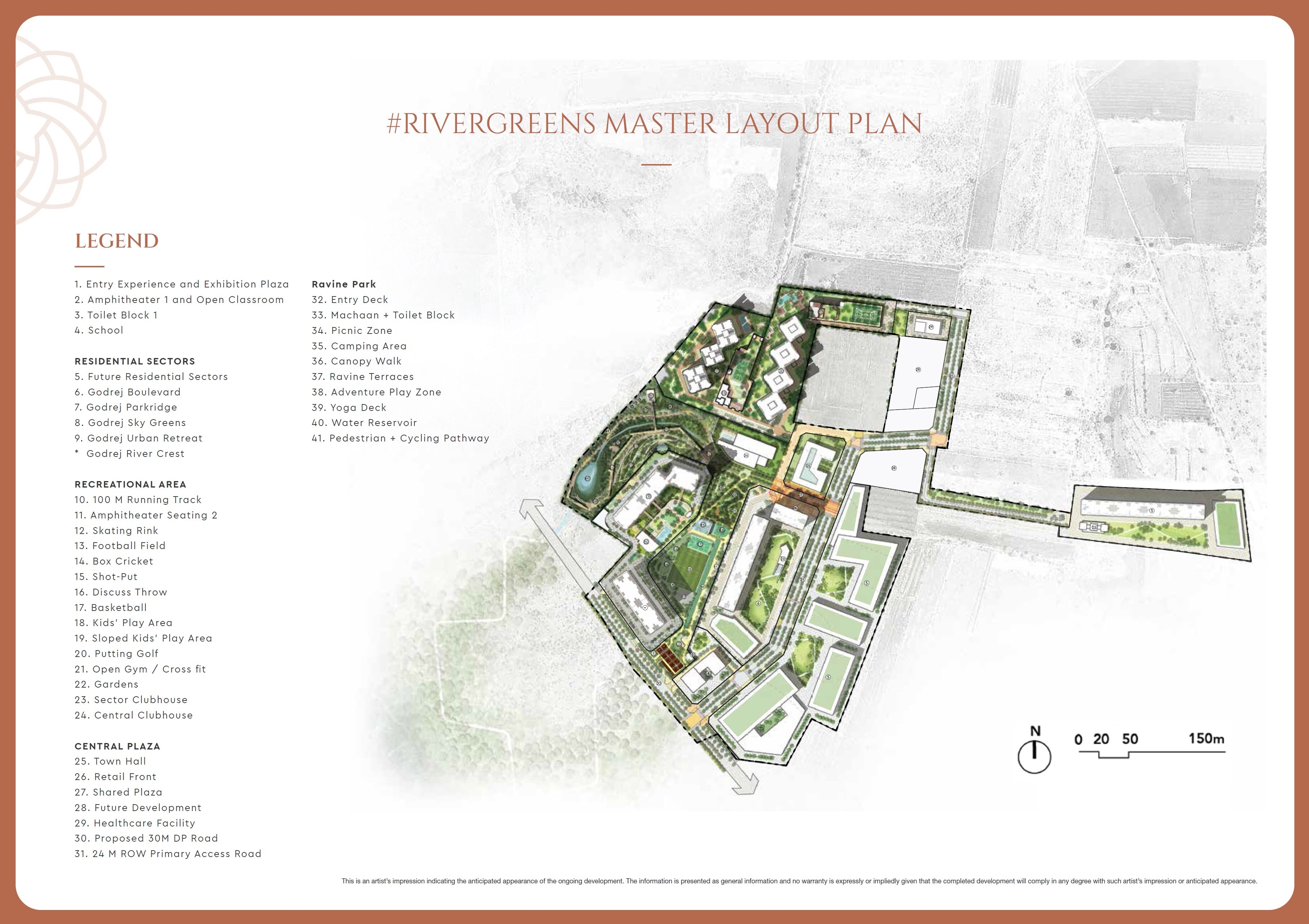The master plan is organized into distinct zones: Residential Sectors, a Recreational Area, a Central Plaza, and a dedicated Ravine Park. Residential development includes Godrej Boulevard, Godrej Parkridge, Godrej Sky Greens, Godrej Urban Retreat, and Godrej River Crest, alongside areas for future residential sectors. While specific unit numbers or densities aren't provided, the layout shows a clear demarcation of these different land uses.