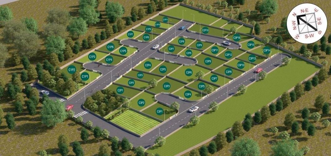 The development is primarily residential, with all plots clearly demarcated for individual residences. Substantial green spaces, including landscaped areas and numerous trees, are integrated throughout the layout. No specific commercial zones or units per acre density figures are indicated within this plan.