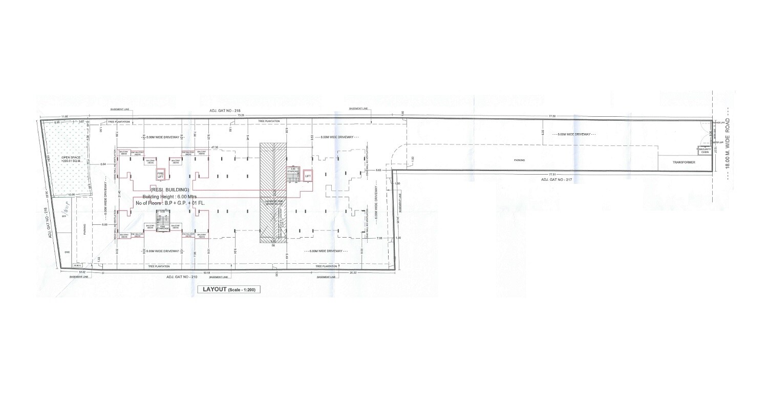 The plan clearly designates areas for the residential building, an open space of 200.51 square meters, ample parking zones, and dedicated tree plantation areas, creating a balanced and functional environment.