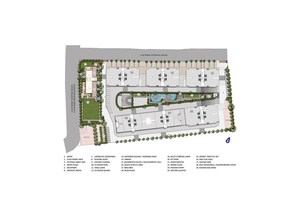 The master plan shows designated areas for residential blocks, open green spaces, and recreational amenities. Residential structures are grouped, while common facilities and landscaped zones are distributed throughout the development. No explicit land use percentages or units per acre are provided.