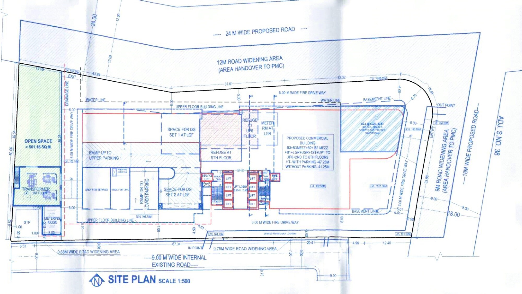 You'll see a clear distinction here; a significant portion is dedicated to the proposed commercial building. We've also allocated a substantial open space, clearly marked as 501.16 square meters, and areas for road widening which will be handed over to the PMC.