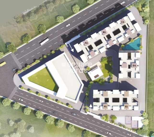 The master plan features six distinct residential blocks labeled A1, B1, C1, D1, E1, and F1. It includes significant open green spaces, most notably a large central lawn area and smaller landscaped sections around the residential buildings. A dedicated area for a swimming pool is also visible.