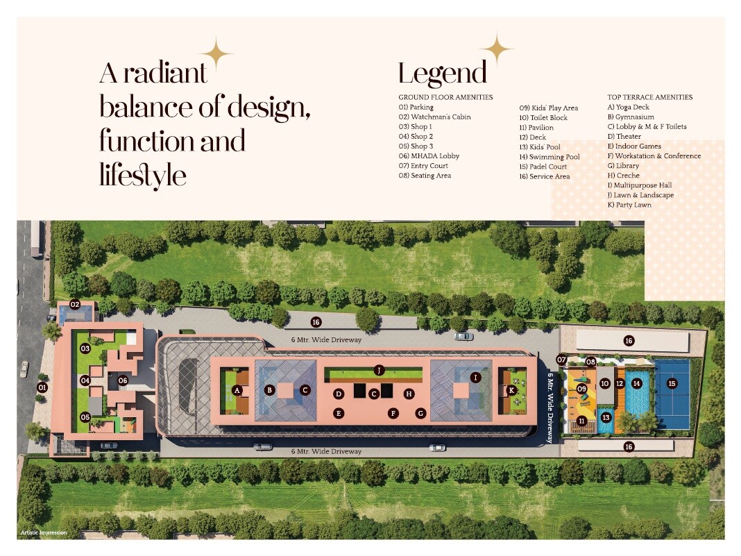 The development integrates commercial spaces with extensive recreational amenities. You'll find three distinct shop areas located at the front of the property, providing convenience. The central building structure is surrounded by open green spaces, and dedicated zones for both ground floor and top terrace amenities offer diverse activities. The design emphasizes a blend of functional spaces and lifestyle elements.