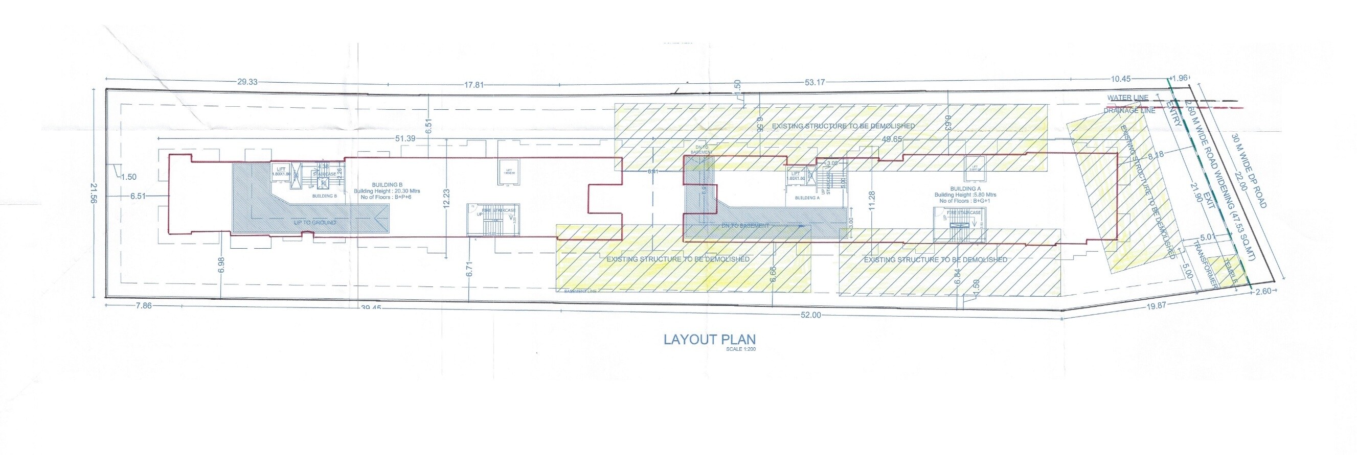 For land use, Building A is planned as a low-rise structure, B+G+1 floors, with a height of 5.80 meters. Building B, on the other hand, will be a taller structure, B+P+6 floors, reaching 20.30 meters. The plan clearly marks areas where existing structures are to be demolished, ensuring a clean slate for our construction. We've also designated space for essential utilities like a transformer. Specific land allocation percentages or units per acre are not detailed in this plan.
