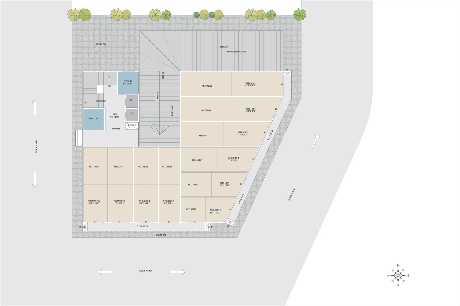 The land is specifically allocated for commercial purposes, housing ten workshop units and one office unit. Each of the workshop units, from Work Shop-1 through Work Shop-10, is designed with a 'MEZZ ABOVE,' indicating an upper mezzanine level within each space.