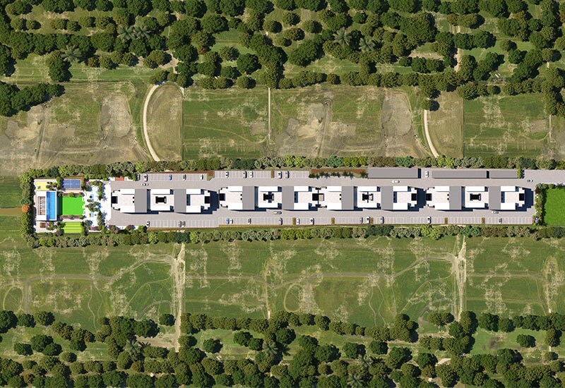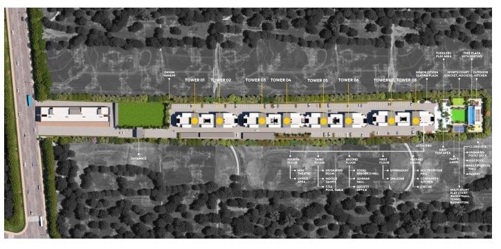 The property is primarily designated for residential use, featuring a linear arrangement of towers. There are substantial open and green spaces allocated alongside the main road and between the residential buildings. A dedicated area for a multi-level clubhouse and various recreational facilities is situated at the eastern end of the development.