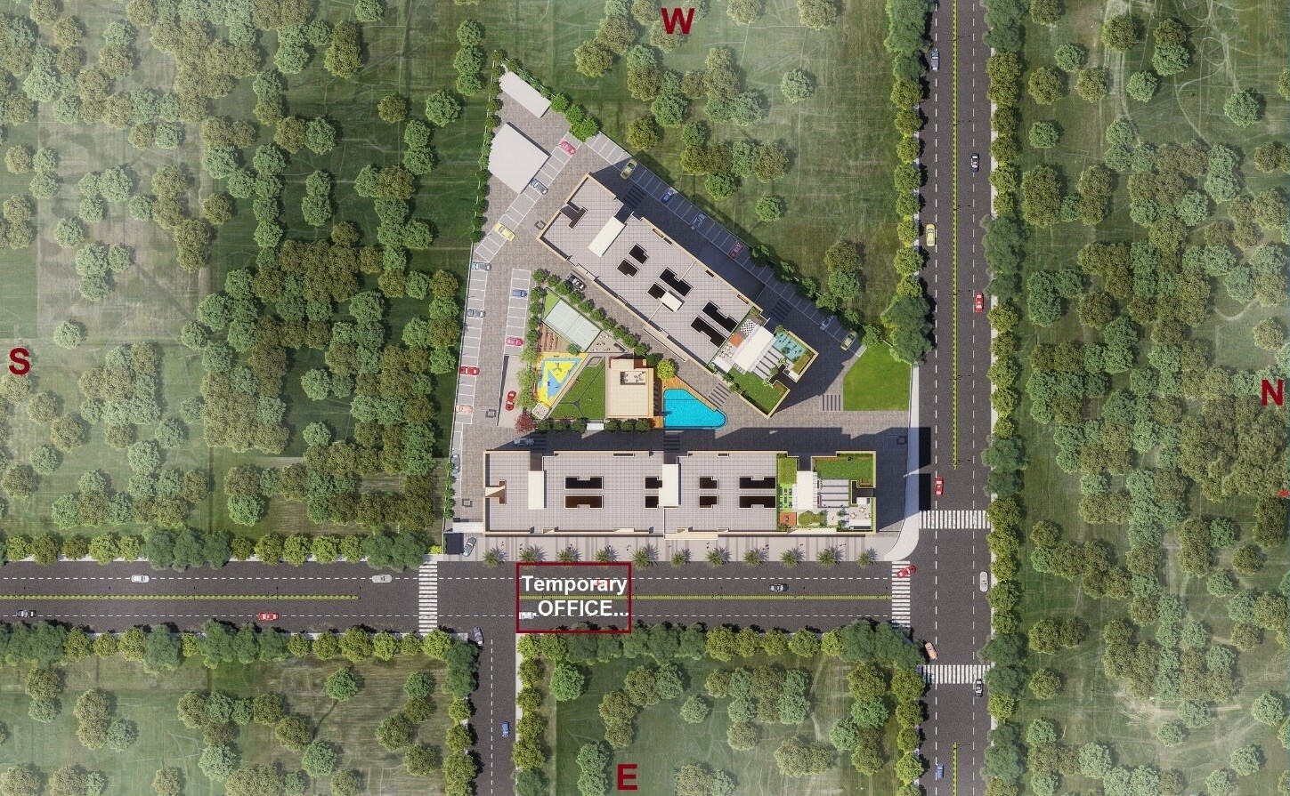 The plan highlights residential structures integrated with designated amenity zones, all set within an extensive green environment. We also have a specific area marked for a 'Temporary OFFICE...' on site, which can be seen in the lower-left detail.