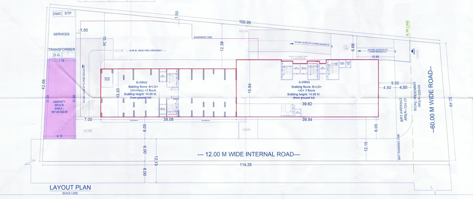 The property is planned with designated areas for residential buildings (A-Wing and B-Wing), utility services, open amenity space, and parking. Specifically, an Amenity Space is allocated 187.00 SQ.M., and a BRT Parking Area covers 124.25 square units.