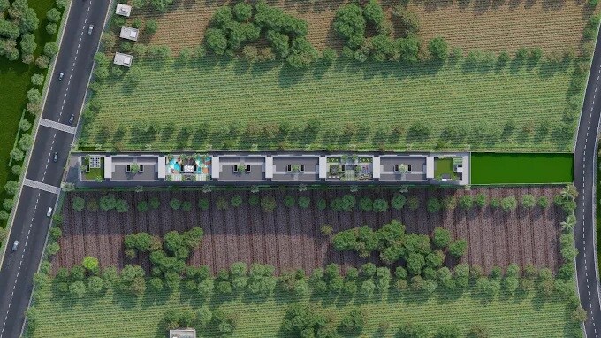 The property is primarily designated for residential use, featuring a row of units. These units are flanked by cultivated fields and trees on the north and south sides, indicating an open, low-density environment. Green landscaped areas are integrated throughout the development, providing open spaces for residents.