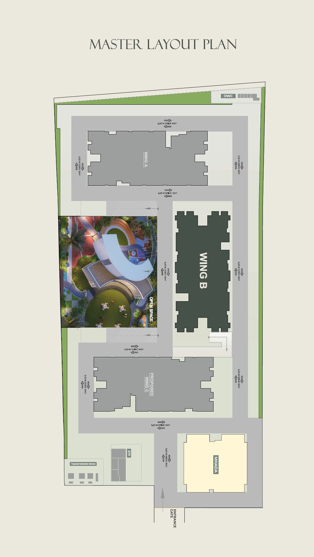 The plan designates areas for residential towers (Wing A, Wing B, Proposed Wing C) and includes a central 'OPEN SPACE' for recreational activities. There are also dedicated areas for essential utilities such as an 'OWC', a 'TRANSFORMER ROOM', and an 'STP'. A separate 'MHADA' area is also indicated on the plan.