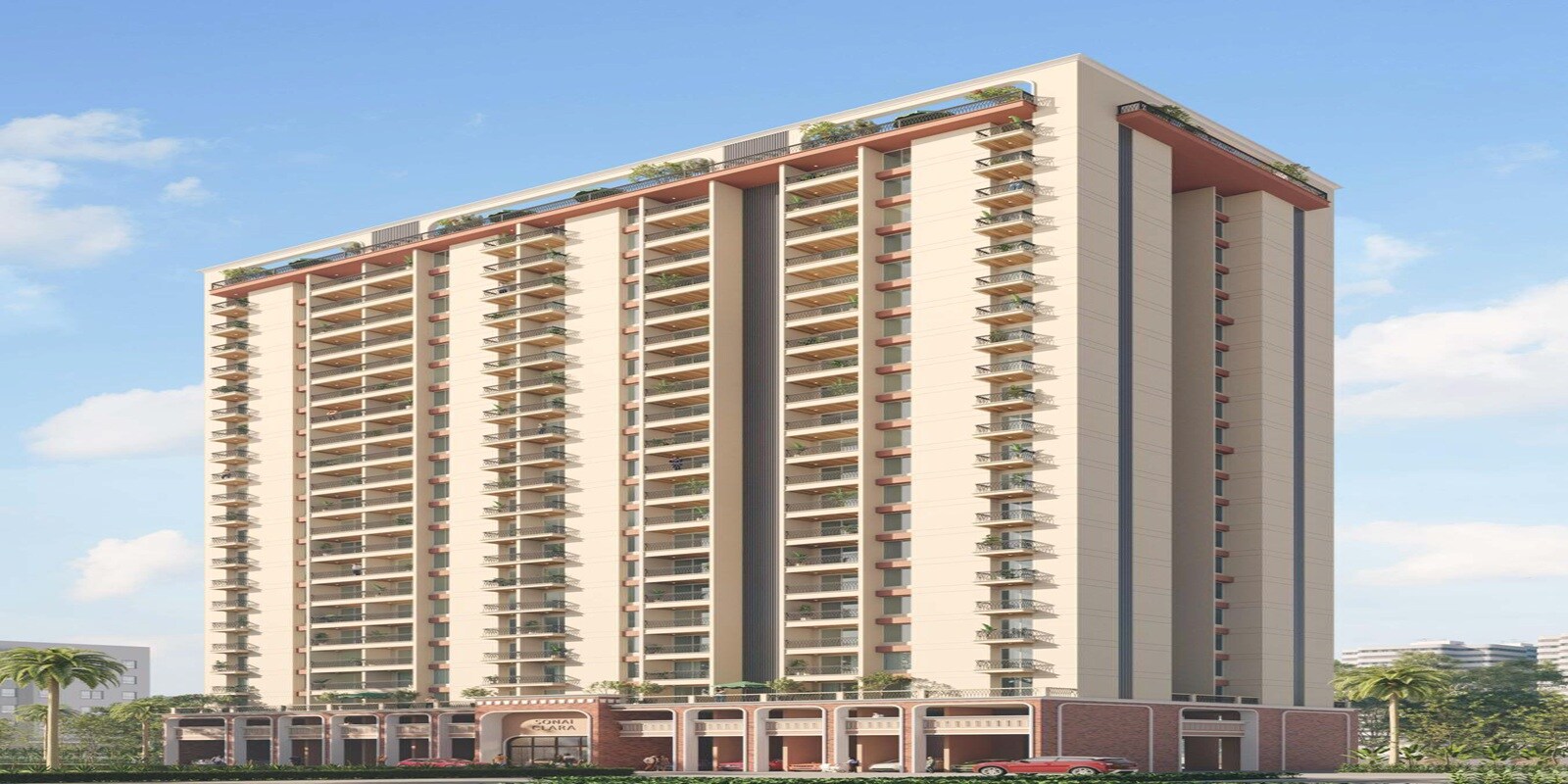 The project, Sonai Clara, is located in Ravet. It features three residential buildings: Wing A, Wing B, and a Proposed Wing C. The master plan does not specify the total land area or the total number of units. External connectivity includes Old Pune Mumbai Highway (3.5 km away) and Mumbai-Bangalore Highway (2.0 km away).