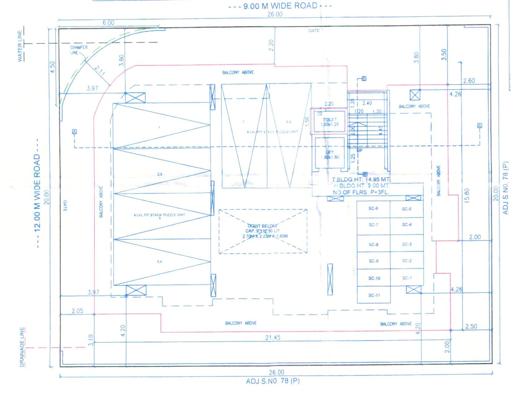 Space Grazia, located in Kothrud, is a project that features a single building comprising a parking level and three residential floors. The building has a total height of 14.95 meters, with a habitable height of 9.00 meters. The property encompasses an area with overall dimensions of 26.00 meters by 20.00 meters.
