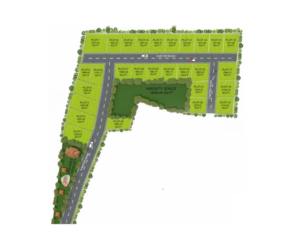 The master plan designates 28 residential plots. It also includes a central 'OPEN SPACE' covering 12270.96 SQ.FT and a larger 'AMENITY SPACE' of 18406.44 SQ.FT located on the western side of the development.