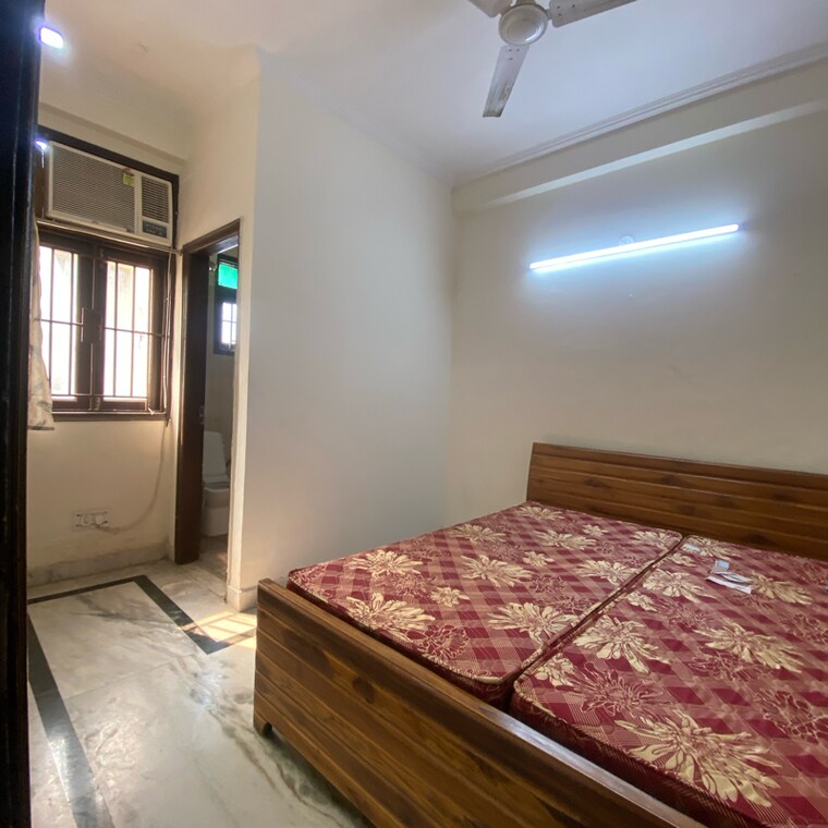 This semi-furnished 2-bedroom, 2-bathroom builder floor on the third floor spans 800 square feet and overlooks a lovely garden.