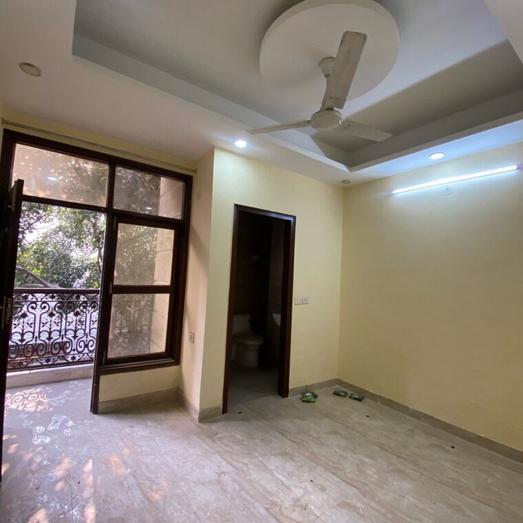 This semi-furnished two-bedroom builder floor in Chhattarpur, Delhi, offers a premium living experience with a peaceful garden view from the first floor.