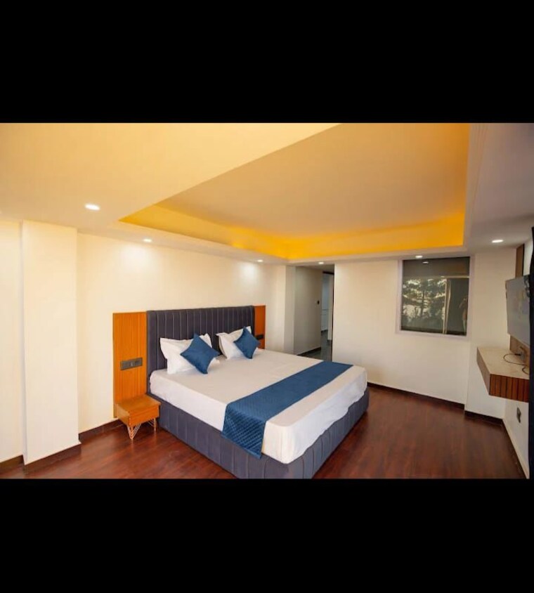 - False ceiling and decorative lighting in the living area.