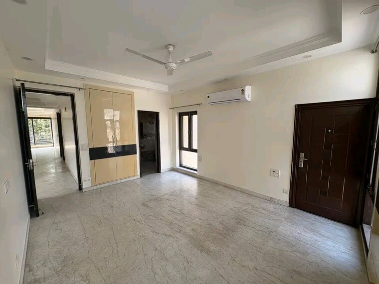 This semi-furnished 4-bedroom builder floor in Chattarpur, Delhi, is available for rent at 52,000 and offers 1800 square feet of living space with a serene garden view from its balcony, making it a perfect family home.