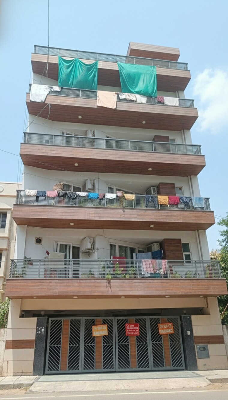 This semi-furnished, 4-bedroom, 3-bathroom builder floor spans 1250 square feet and sits on the third floor of a four-story building, providing a comfortable living space with a pleasant road view.