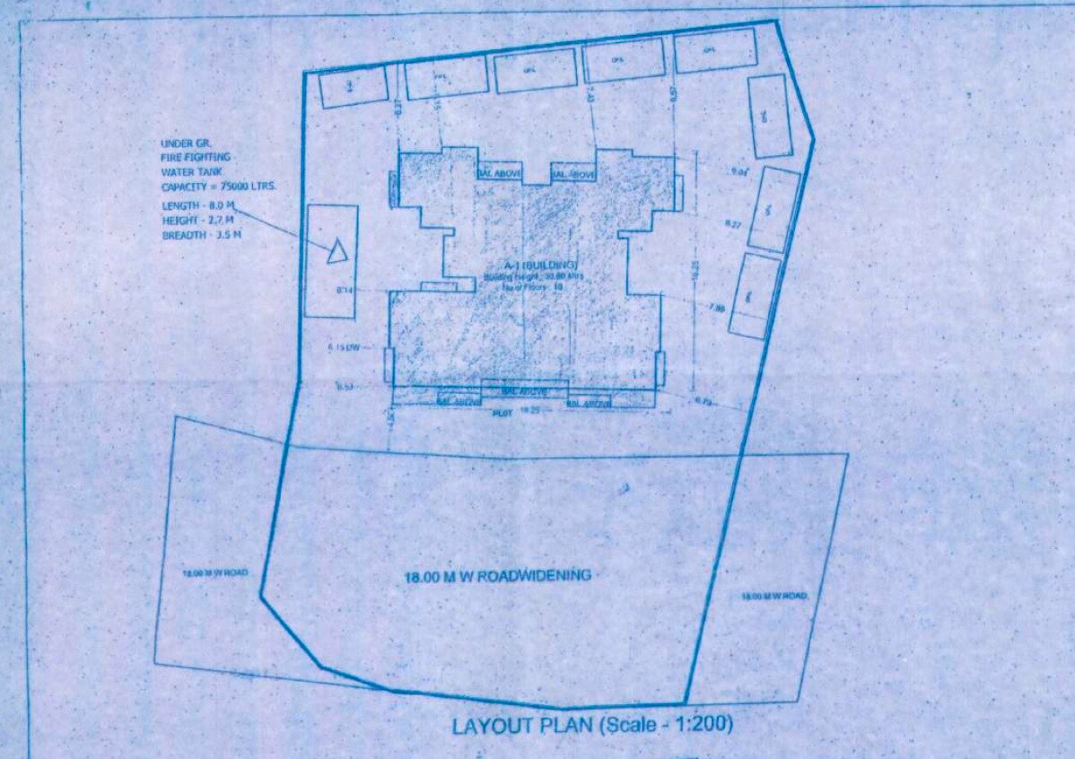 The primary land use here centers around the A-1 Building, which is the main structure for this development. We also have designated areas for utilities, like the underground fire-fighting water tank, and surrounding road infrastructure. This plan doesn't specify any units per acre or percentage allocations for different zones.