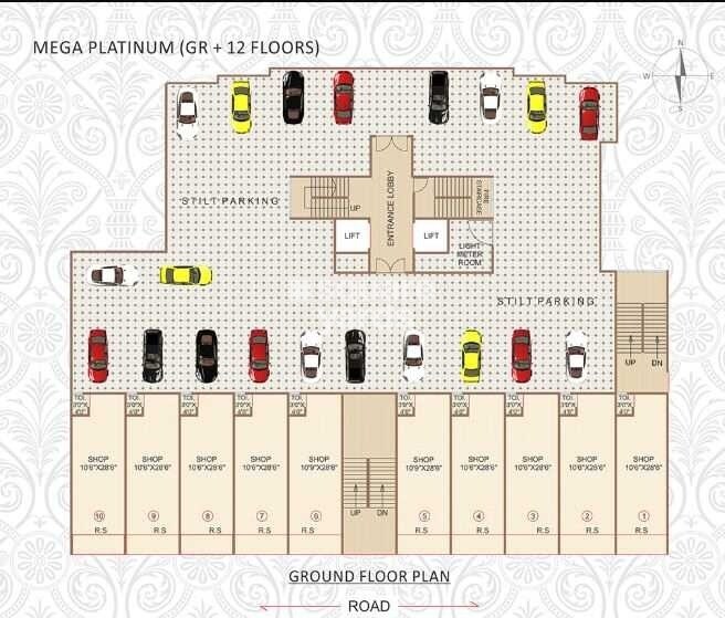 The ground floor of the MEGA PLATINUM building is designated for mixed-use, combining commercial spaces with extensive stilt parking. It features 10 individual shop units along the road-facing side, complemented by dedicated stilt parking areas for vehicles.