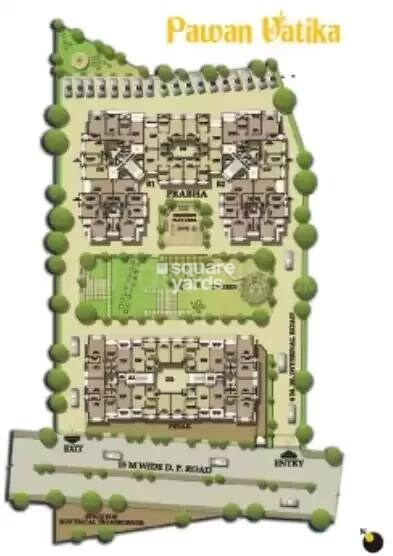 Pawan Vatika is comprised of two main residential blocks. The upper block appears to consist of four residential clusters or towers, while the lower block contains two residential clusters or towers. The overall layout integrates residential living with dedicated open spaces and access roads.