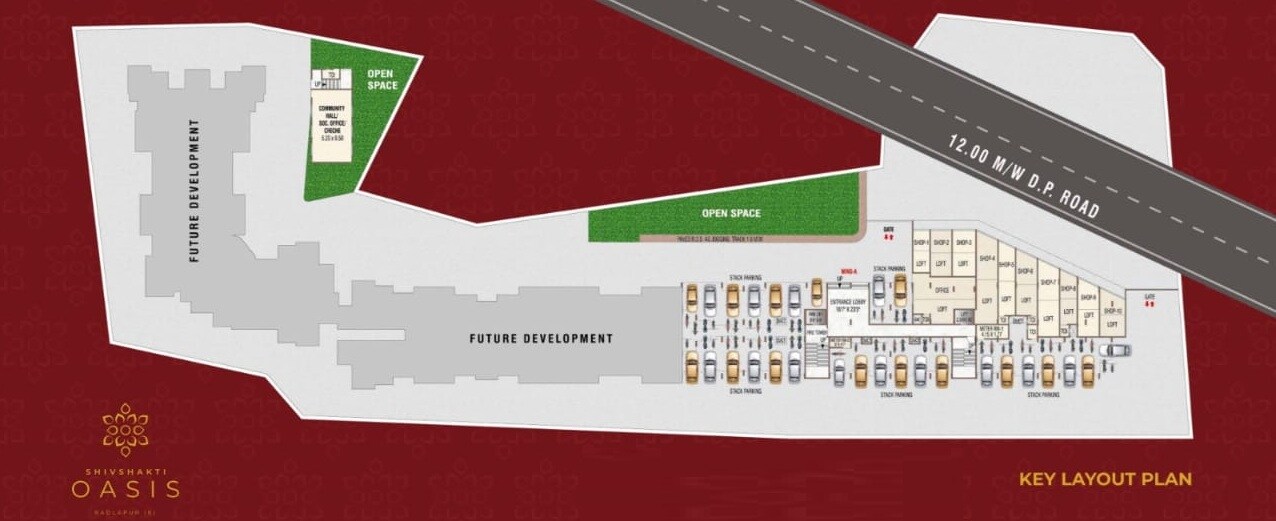 Shivshakti Oasis is situated in Shirgaon, featuring a layout that includes current development alongside significant areas reserved for future expansion. The plan incorporates a mix of commercial spaces, such as shops and offices, along with residential loft units.