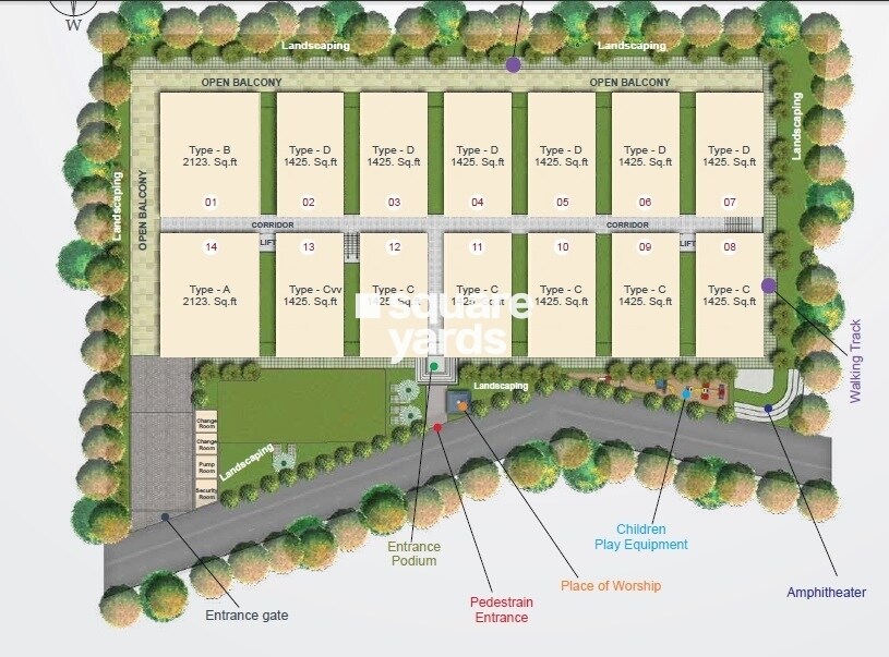 The development integrates residential units with extensive landscaping that surrounds the building and borders the entire property. Each residential unit also includes an open balcony, and dedicated areas are set aside for various amenities.